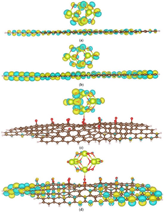 Due to the complexity of calculating the bandgap values for the studied materials, particularly because of the presence of an f-element (Ce), we instead evaluate the photocatalytic ability by examining the spatial distribution of HOMOs and LUMOs, as discussed in [33]. A greater spatial separation between HOMOs and LUMOs may correlate with a lower recombination rate of photogenerated electrons and holes. Figure 7 presents the frontier molecular orbitals, including the HOMO and LUMO, for the CeO2/GP (a) and CeO2/rGO (b) systems.