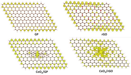 We further calculated the fractional occupation number weighted density (FOD) to quickly and robustly provide information on the localization of “hot” (strongly correlated and chemically active) electrons in catalytic systems. The FOD map of GP and rGO (Figure 8) reveals that in the absence of CeO2, the active electrons are concentrated on the carbon atoms on the surface of the material. In the CeO2/GP and CeO2/rGO systems, active electrons are also distributed on the ceria cluster, which is particularly noticeable in the case of CeO2/rGO. This finding is interesting when correlated with the HOMO and LUMO images of CeO2/rGO (Figure 7c,d). The active electrons are primarily located in the HOMO of the ceria cluster, which can be excited and transferred to the LUMO located on rGO, thereby reducing the recombination ability.