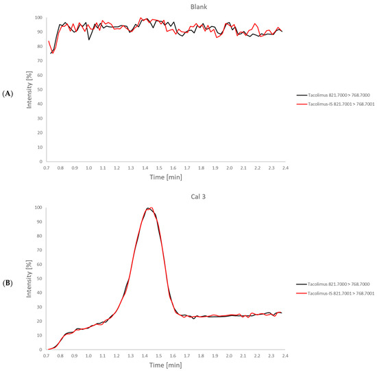 Figure 1A,B show the recorded MRMs (tacrolimus in black and tacrolimus-IS in red) in a blank sample and in calibrator 3, respectively. Through a combination of automatic software peak integration for tacrolimus (grey peak area) and manual integration for a fixed elution time window from 0.9 to 2.0 min for tacrolimus-IS (red hatched peak area), all required metadata could be exported from the MS software (v 4.1) and imported into Excel. The actual area IS (light red peak area) that represents the externally infused tacrolimus is calculated by area tacrolimus-IS (red hatched peak area)—area tacrolimus (grey peak area)—as demonstrated in Figure 1C (see Equation (1)).