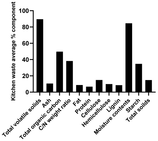 The waste produced in the kitchen depends on where it has come from, resulting in variability and the exact nature of the waste being ambiguous to identify across nations. The majority of KW normally consists of rice, meats, and veggies based on published reports. The production stage consists of roughly 2% oil, 4% meat and fish waste, 6% dairy waste, 14% bowls of cereal, 2% roots and tubers, and 48% foods and vegetable waste. Furthermore, Vavouraki reported that different KW’s compositions, including roughly 18.5% solid components, 81.5% moisture, and a pH range between 4 and 6, are regularly generated [19] (Figure 1). These substances have the potential to synthesize high-value products. Nearly 60% of KW’s composition is made up of carbohydrates, 20% of which are proteins, and 10% of which are lipids [20]. Meat and food waste are two of the major parts of KW, which are rich sources of nitrogen and some micro- and macronutrients. Various forms of food waste contain total nitrogen in the range of 1.1% to 9.6%, with an average value of 4.6%. Phosphorus is also found in the ratio of 0.1 to 1.2% in KW [21]. The most important characteristics of KW are its moisture content, humidity, and calorific value. Bacteria can create a variety of biopolymers, including PHA, and biofuels like methane, hydrogen ethanol, etc., upon hydrolysis of KW, which releases simple sugars by fermentation. Therefore, it is crucial to find a technology that directly transforms the organic components of KW into high-value products like PHA to address the issues.