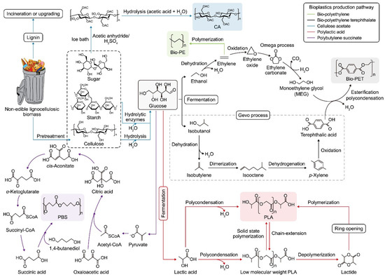 Polylactic acid (PLA), polybutylene succinate (PBS), cellulose acetate (CA), bio-based polyethylene terephthalate (Bio-PET), and bio-polyethylene (Bio-PE) production pathways from non-edible lignocellulosic biomass.
