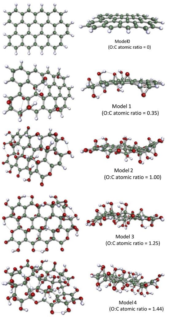 The relative quantity of each kind of oxygenated group attached to the graphene framework also corresponds to experimental data (Figure 13) [11], but their distribution on the molecular domain when creating the models was somewhat arbitrarily determined. In all the structures proposed, valences of peripheral carbons were completed with hydrogens when appropriate. Although 24-fused hexagon models were also evaluated in this work, they were discarded due to the marked increase in the computational cost without a significant improvement in the results.