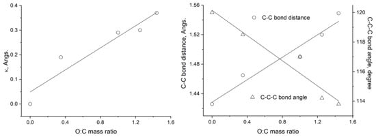 Loss of planarity (κ, Left) and C-C bond distances and C-C-C angles (Right) in the graphene framework as a function of the O/C mass ratio for graphene (Model 0) and graphene oxide derivatives (Models 1 to 4).
