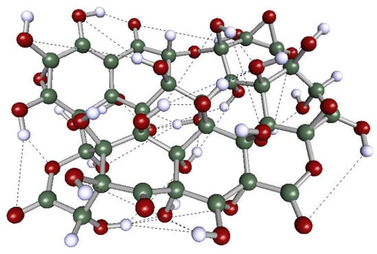 Calculated Natural Population Analysis (NPA) atomic charges [42] confirm that H-bonding additionally polarizes the atoms involved. The charges are −0.5 for the oxygen atoms of epoxide, carbonyl, and ether groups not involved in H-bonds but decrease to −0.6 when they participate in hydrogen bonds. In similar situations, the charges of the oxygen atoms belonging to hydroxyl groups fall from −0.7 to −0.8.