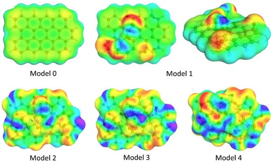 Oxygen substitution generates new red and blue regions on the σ-surface (Figure 5), indicating the presence of groups positively and negatively polarized at the surface of the graphene oxides, which correspond to the hydrogen and oxygen atoms, respectively. Despite the polarization of the GO surface described above, yellow–green regions persist at their surfaces (Models 1 to 4) along with the red and blue regions already mentioned. Similarly to the case of graphene, this indicates the presence of neutral highly polarizable groups.
