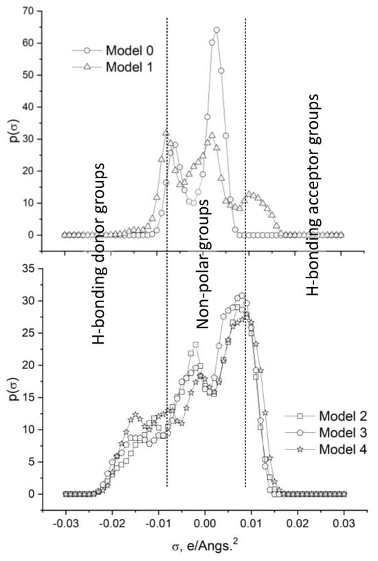 In the σ-profile of the GOs, a broadband arises in the regions where σ < −0.008 e/Å2 (HB donor region), and a shoulder appears where σ > 0.008 e/Å2 (HB acceptor region). The first of these regions is associated with the H atoms of the hydroxyl groups, whereas the second one is related to the O atoms in the different oxygenated groups attached as O-C substituents. These two types of signals in the σ-profiles suggest that the oxidized graphene derivatives could show a certain limited amphoteric character. The signal at σ ≈ −0.015 e/Å2 grows with the O/C ratio, peaking in Model 4, which correlates with the increasing number of the hydroxyl groups attached to the graphene surface (see Section 3.1. Molecular Models). Besides, the significant reduction of the peak at σ ≈ 0.003 e/Å2 due to oxygen substitution (from Model 0 to Models 1–4) reflects the break of the molecular conjugation by the oxygen coordination.