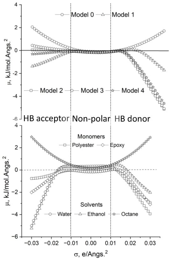 Regarding the σ-potentials of graphene (Model 0) and octane (Figure 7), it can be inferred that they do not interact favorably (μ > 0 kJ/mol·Å2) with polar components, which exhibit μ < 0 kJ/mol·Å2 if σ < −0.008 e/Å2 and σ > 0.008 e/Å2. The thermodynamic behavior is noticeably different when it comes to the polar solvents and monomers and the graphene oxides selected for the current analysis (Figure 7). The polar solvents and the monomers exhibit a marked amphoteric character (μ < 0 kJ/mol·Å2 for σ < −0.008 e/Å2 and σ > 0.008 e/Å2) being capable of interacting favorably with both proton-donor and proton-acceptor groups, i.e., the curves μ (kJ/mol·Å2) vs. σ (e/Å2) reveal a certain symmetry. However, this symmetry is broken for some of the GOs studied. All of them show HB potential donor capacity (μ < 0 kJ/mol·Å2 for σ > 0.008 e/Å2) due to the hydrogen atoms of the hydroxyl groups, the value of μ (kJ/mol·Å2) being, as a rule, more negative as the number of OH groups in the GO increases (blue regions in the σ-surfaces, Figure 4). This is analogous to what occurs with the peak at σ ≈ −0.015 e/Å2 in the σ-profile (Figure 6), which is already discussed. However, in several cases (Models 2 to 4), μ ≈ 0 kJ/mol·Å2 when σ < −0.008 e/Å2, showing a weak acceptor capacity of the oxygen attached to the carbonous surface. This is congruent with the yellow–red color distribution on the σ-surface (Figure 5) and the presence of a shoulder in the σ-profile (Figure 6) when σ > 0.008 e/Å2, which are also mentioned before.