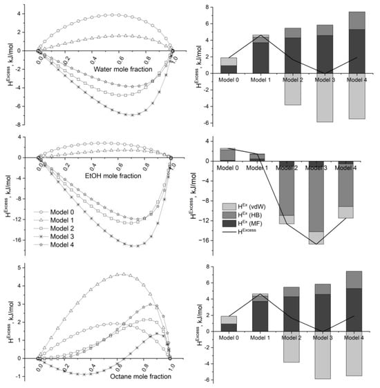 In the COSMO-RS model, the excess enthalpy (HExcess) of a binary mixture is obtained by the algebraic sum of three contributions associated with electrostatic misfit (MF), van der Waals (vdW), and hydrogen bond (HB) intermolecular interactions (Equation (5)). The contributions of each type of these interactions to the excess enthalpies are evaluated in the current work.