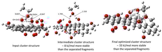 (EtOH + GO (Model 1)) cluster structures representative of the geometry optimization sequence. [Left]—Input geometry. [Middle]—Optimized structure at the first stage of the optimization pathway. [Right]—Final optimized structure. Interatomic distances are given in Ångstrom.