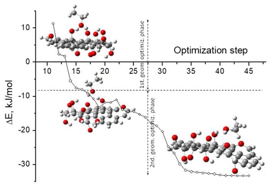 Although the geometry optimization was carried out uninterruptedly (i.e., in only one run), two well-differentiated phases can be recognized in the optimization profile (Figure 11). Firstly, the computational procedure optimized the O···H interatomic distances (enlarged compared to the input structure) preserving the perpendicular orientation of the ethanol molecule relative to the GO surface.