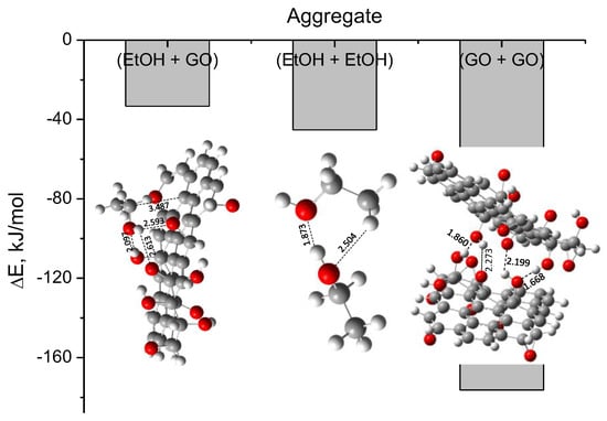 From the set of results presented in Section 2.3 and Section 2.4, an obvious question arises: Why is the interaction (EtOH + GO (Model 1)) not thermodynamically favorable for any composition of the mixture (Figure 8) if the cluster EtOH-GO (Model 1) is energetically stable (Figure 10 and Figure 11)? The solution to this question relates to the stability of the (EtOH + EtOH) and (GO + GO) aggregates. The minimum energy structures obtained for each of them (Figure 12) are, respectively, 45 and 176 kJ/mol more stable than the individual isolated species (Figure 12). This means that (EtOH + EtOH) and (GO + GO, where GO = Model 1) are more stable than (EtOH + GO, where GO = Model 1). (EtOH + EtOH) aggregate could model the ethanol dimerization, whereas (GO + GO) dimer could refer to the aggregation of dispersed graphene oxides in the solvent.
