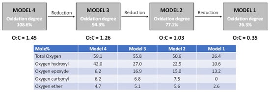 Experimental information used to define both the O/C mass ratio of the GO models and the distribution by type of the oxygenated functional groups. The O/C mass ratio was established by elemental analysis, and group distribution by IR and Raman analysis [11,12]. The oxidation degree is presented on a molar basis.
