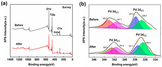 Figure 1a presents the typical XPS spectra of 1 wt.% Pd/TiO2 pre- and post-CO exposure, indicating the changes in elemental composition and chemical state. As can be seen from the figure, Pd/TiO2 contains Ti and O elements before and after exposure to CO and has obvious characteristic peaks of C and Pd. The presence of the C element is due to the adsorption of CO by Pd/TiO2 during CO exposure. The presence of the Pd element proves the successful loading of Pd on TiO2. The XPS spectra of Pd 3d for the catalysts are shown in Figure 1b. In Figure 1b, the 3d orbital of Pd has two independent orbitals of Pd 3d5/2 and Pd 3d3/2, and the binding energy difference between these two orbitals is about 5 eV [30,31]. The characteristic peaks of the binding energy of ~336 eV and ~337 eV correspond to Pd0 and Pd2+, respectively. After CO exposure, the characteristic peak shifted to the right by 0.9 eV, indicating a reduction in Pd2+ to metallic Pd. The relative peak area ratio of Pd0/Pd2+ in the after-CO exposure sample was significantly larger than that in the before-CO exposure sample (Figure 1b). In the XPS studies previously carried out by Zedan et al. for Cu-doped Pd/TiO2, the binding energies of metallic Pd were identified to be 337.1 eV (Pd 3d5/2) and 342.5 eV (Pd 3d3/2), which were in good agreement with our results [32].