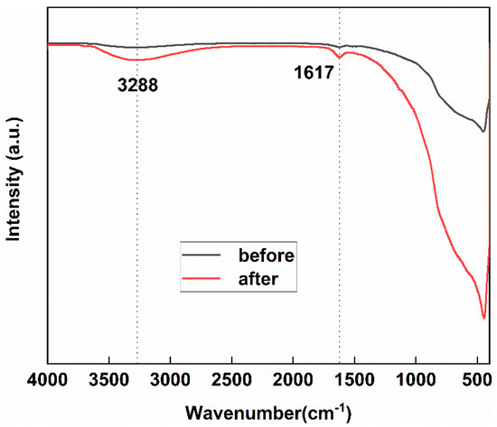 Figure 2 shows the FT-IR spectra before and after the reaction of 1 wt.% Pd/TiO2 with CO. There are two distinct bands between 1000 cm−1 and 4000 cm−1. The infrared band at 3288 cm−1 belongs to the O-H group vibration on the catalyst surface. After calcination, part of the H remains in the material and enters the TiO2 crystal lattice to form Ti-OH. The infrared band at 1617 m−1 is caused by C=O stretching. There are more O-H groups at 3288 cm−1 after the reaction of 1 wt.% Pd/TiO2 with CO, indicating that there is a strong cooperative interaction between CO and Ti-OH. More C=O groups appeared after the reaction at 1617 cm−1, indicating that CO is adsorbed and oxidized in large quantities on the catalyst surface [33].