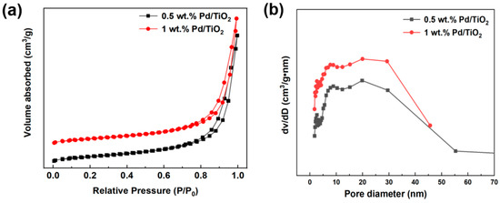(a) N2 adsorption–desorption isotherms of the catalysts of 0.5 wt.% and 1 wt.% Pd/TiO2, and (b) their corresponding pore size distributions.