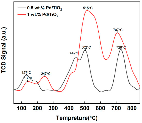 The interactions between CO and the 0.5 wt.% and 1 wt.% Pd/TiO2 catalysts were detected by CO-TPD, and the corresponding CO desorption profiles are shown in Figure 4. The desorption peaks of both catalysts mainly ranged at 340–610 °C and at 650–820 °C, which corresponded to moderate and strong CO surface interactions [36]. It was obviously found that the amount of CO desorption on the surface of 0.5 wt.% Pd/TiO2 was much lower than that on the 1 wt.% Pd/TiO2. As a result, the interaction between CO and the Pd/TiO2 was enhanced by increasing the Pd content, which provided more active sites for CO adsorption and, thereafter, improved the redox properties of Pd/TiO2. Therefore, the CO gasochromic performance can be enhanced. Compared with the sample of 0.5 wt.% Pd/TiO2, the number of obvious CO desorption peaks was reduced from three to two in the sample of 1 wt.% Pd/TiO2, while its moderate-temperature CO desorption peak was shifted to the right from 502 °C in the 0.5 wt.% Pd/TiO2 to 515 °C. This indicated that the interaction between CO and the catalyst at a moderate temperature range was enhanced. Liu et al. previously carried out DFT calculations of CO adsorption over Pd/graphene and found that CO stretching was redshifted during CO oxidation, showing the positively charged nature of the Pd atoms [37]. Their DFT calculations were consistent with our CO-TPD measurement, which found that CO adsorption was enhanced with a Pd content increase.