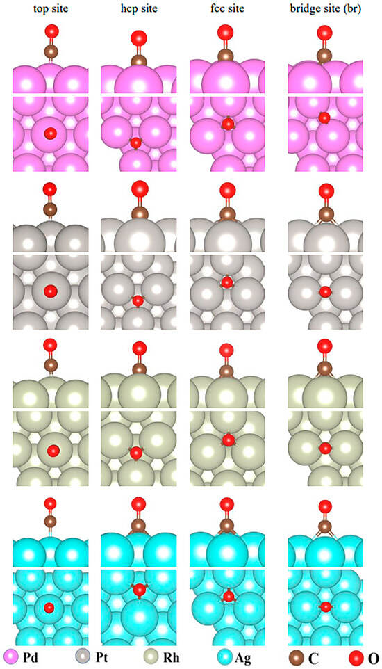 The most stable adsorption configurations of CO on these four surfaces are shown in Figure 5, and the corresponding adsorption energies are shown in Table 2. A negative adsorption energy means the adsorption is exothermic. The more negative the value, the more energy is released and the stronger the interaction presented. It can be clearly found from Table 2 that the CO adsorption on the Pd(111) surface at the hcp site had the largest energy of −1.99 eV, suggesting that CO had the strongest interaction with the Pd surface. The corresponding bond lengths of three Pd-C bonds were 2.07, 2.07, and 2.08 Å. The CO adsorption energy at the fcc site over Pd(111) was −1.94 eV, which was close to that at the hcp site. The largest CO adsorption energies over Pt(111), Rh(111), and Ag(111) were −1.85 eV (at hcp site), −1.81 eV (at top site), and −0.07 eV (at the top and fcc sites), respectively. All these energies were smaller than that on the Pd(111) surface. Therefore, the metal Pd presented the strongest attraction for CO compared with other noble metals Pt, Rh, and Ag. The CO adsorption energies on the Ag(111) surface were as small as −0.06 and −0.07 eV, much smaller than those on Pd(111), Rh(111), and Ag(111), suggesting that Ag had the weakest attraction for CO. The corresponding bond length of Ag-C at the top site was 2.17 Å, which was also longer than those on Pd(111). The largest CO adsorption energies on the Pt(111) and Rh(111) surfaces were 0.1 eV, smaller than that on Pd(111). Compared with Pd, the noble metals Pt and Rh may have a similar CO adsorption capacity. As a result, the interactions between CO and the noble metals were in the order of Pd > Pt > Rh >> Ag.