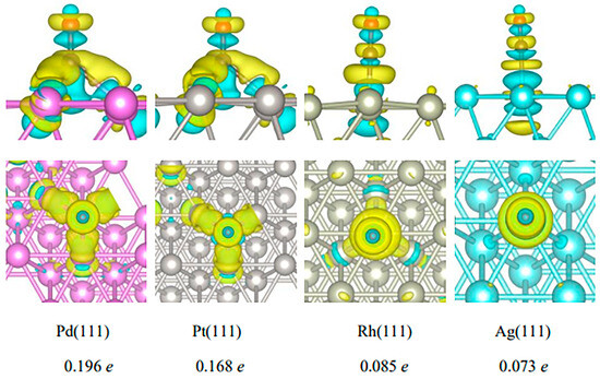 Bader charge analysis was used to calculate the differential charge density and the charge transfer of CO over the Pd(111), Pt(111), Rh(111), and Ag(111) surfaces, and the corresponding results are presented in Figure 6. A yellow isosurface represents electron enrichment, and a cyan isosurface represents charge depletion. Figure 6 shows that tiny electrons were shifted between CO and surfaces of Rh(111) and Ag(111), which had values as low as 0.085 and 0.073 e, respectively. CO had no obvious charge transfer on the surface of Rh(111) and Ag(111). Compared with Rh(111) and Ag(111), the electron transfers between CO and the surface of Pd(111) and Pt(111) were more intense. Electrons were enriched from the Pd(111) and Pt(111) surfaces to CO, and the charge transfer amounts were 0.196 e and 0.168 e, respectively. The molecule CO was an electron acceptor, while the metal surfaces were electron donators. The number of charges transferred from Pd(111) to CO was the largest, confirming that the interaction between CO and Pd was the strongest. This is consistent with the abovementioned results of CO adsorption energy. Compared with the Pt(111), Rh(111), and Ag(111) surfaces, both the charge transfer and the adsorption energy of CO on the surface of Pd (111) were the largest, and the interaction between CO and Pd(111) was the strongest. The greater the electron transfer from the surface of Pd (111) to CO, the easier the valence state change, resulting in an easier and faster color change after CO exposure. Therefore, it was concluded that Pd was the best noble metal active component of the supported TiO2 catalyst for highly sensitive gasochromic CO.