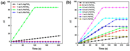 Variation in the values of color difference with respect to CO exposure time: (a) over Ag/TiO2, Pt/TiO2, Pd/TiO2, and Rh/TiO2 with the metal content of 1 wt.%; and (b) over Pd/TiO2 with different Pd content of 0.1–5 wt.%.
