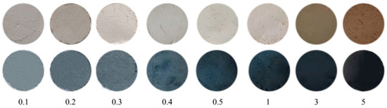 The effects of different contents of Pd on the gas-chromic performance of materials were studied. The results are shown in Figure 8b. Samples with a Pd content of 0.1 wt.%, 0.2 wt.%, 0.3 wt.%, 0.4 wt.%, 0.5 wt.%, 1 wt.%, 3 wt.%, and 5 wt.% were selected for color change experiments in the CO environment. The result shows that the amount of ∆E is proportional to the Pd content. The chromatic aberration values reached a maximum value of 90 when the content of Pd was 1 wt.%. The color contrasts of Pd/TiO2 before and after the reaction with CO are shown in Figure 9. It can be clearly seen from the figure that the color difference before and after the reaction of 1 wt.% Pd/TiO2 is the most obvious. Therefore, 1 wt.% Pd/TiO2 can be used as an effective gas detection material for the detection of CO in air at room temperature.