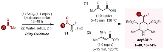 Acyl-1,4-DHPs can be readily prepared from corresponding glyoxals or glyoxal hydrates in a single step in multigram quantities by a modified Hantzsch procedure (Scheme 3) [15]. Many glyoxals or glyoxal hydrates (S1) are commercially available, although relatively expensive. Phenylglyoxal hydrate, for example, costs €74.3 for 5 g (Sigma-Aldrich, St. Louis, MO, USA, June 2024). Alternatively, glyoxals can be prepared via Riley oxidation of methyl ketones in an operationally simple procedure, involving refluxing of methyl ketones with SeO2 in 1,4-dioxane. In most cases, the reaction is clean and the product can be purified by recrystallization [15].
