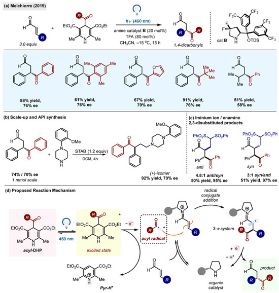 The first application of acyl-1,4-DHPs in organic synthesis was reported by the Melchiorre group, which used them for asymmetric conjugate radical additions of acyl radicals to iminium ions to produce enantioenriched 1,4-dicarbonyl compounds in high yields and ee’s (Scheme 5a) [15]. Enantioselective radical reactions are generally rare and notoriously difficult due to the high reactivity of radical species [33]. In this work, imine organocatalysis was found to be compatible with the DHP radical system. The organic catalyst used, B, was the modification of Jorgensen’s catalyst derived from proline.