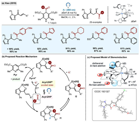- Zhang, K.; Lu, L.-Q.; Jia, Y.; Wang, Y.; Lu, F.-D.; Pan, F.; Xiao, W.-J. Exploration of a Chiral Cobalt Catalyst for Visible-Light-Induced Enantioselective Radical Conjugate Addition. Angew. Chem. Int. Ed. 2019, 58, 13375–13379. [Google Scholar] [CrossRef] [PubMed]