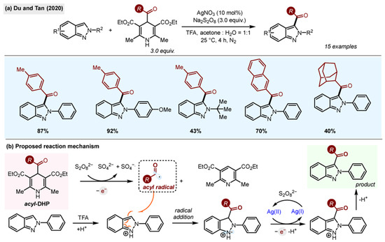 Du and Tan reported the synthesis of 3-acylated 2H-indazoles (Scheme 8) using acyl-1,4-DHPs and a classic Minisci oxidative system: AgNO3/Na2S2O8 [26]. 2H-Indazoles are common motifs in bioactive natural products and pharmaceutical agents as bioisosteres of indoles, benzimidazoles and purines. The reaction was successful for 2-aryl- and 2-alkyl-substituted 2H-indazoles, although alkyl groups gave lower yields.