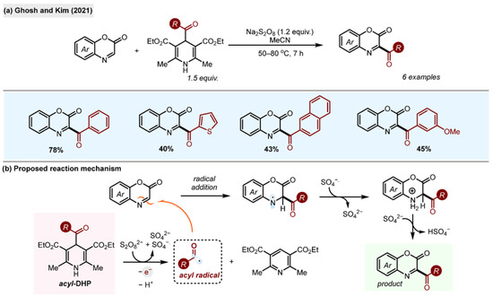Another important class of N-heteroarenes acylated with 1,4-acyl-DHPs is 2-benzoxazninones [37]. 2-Benzoxazinones are of interest to medicinal chemists due to their potent bioactivities. Cephaloindole A, for example, exhibits anti-cancer properties. Ghosh and Kim reported a Minisci-type oxidative acylation of 2-benzoxazinones with acyl-1,4-DHPs using the inexpensive Na2S2O8 as an oxidant (Scheme 9a).