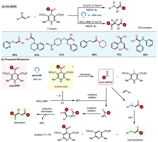 (a) Radical addition to C-C double bonds: hydroacylation and dihydroacylation of styrenes by Xia (2020) [40]. (b) Proposed mechanism.