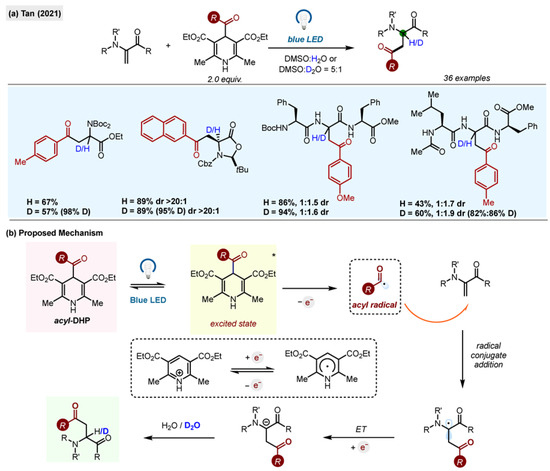 The dual role of 1,4-acyl-DHP as a single-electron reductant and acyl radical precursor was exploited by Tan et al., who reported a synthetic protocol for the preparation of unnatural β-acylated α-amino acids by photochemical addition of acyl radicals to dehydroalanines, which are also activated olefins (Scheme 13) [41]. The intermediate anion, produced after the reduction of the adduct formed by acyl radical addition to a C-C double bond, was quenched with D2O, allowing for the selective introduction of deuterium atoms to the α-position of synthesized amino acids (96% deuterium incorporation for the model reaction). When chiral Karady–Beckwith alkenes were used as substrates, the deuteration of the anion occurred with a high degree of diastereoselectivity (20:1).
