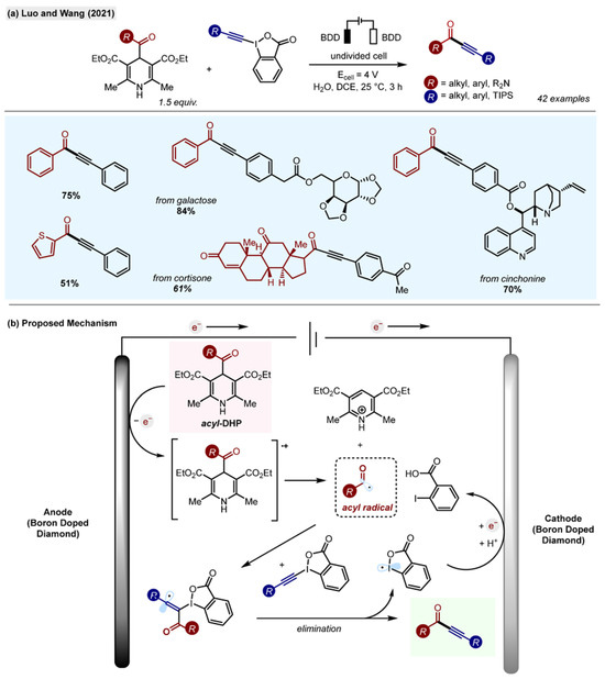 - Luo, X.; Wang, P. Ynonylation of Acyl Radicals by Electroinduced Homolysis of 4-Acyl-1,4-dihydropyridines. Org. Lett. 2021, 23, 4960–4965. [Google Scholar] [CrossRef] [PubMed]