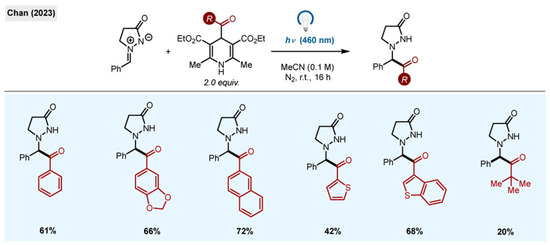 The group of Chan found that acyl radicals, generated from 1,4-acyl-DHP, react efficiently with azomethine imines to form 1-acyl 3-pyrazolidinones in high yields (Scheme 17) [48]. 3-Pyrazolidinones are important N,N-heterocyclic compounds, acting as building blocks in synthesis and exhibiting biological activities. It was found that the reaction proceeded upon direct irradiation of acyl-1,4-DHPs with visible light, and, in contrast to alkyl-1,4-DHPs, did not require a photocatalyst. The authors reported acyl transfer from aryl, heteroaryl and alkyl acyl-1,4-DHPs, although the yields for the tert-butyl substituent were significantly lower (20%) compared with benzoyl (62%).