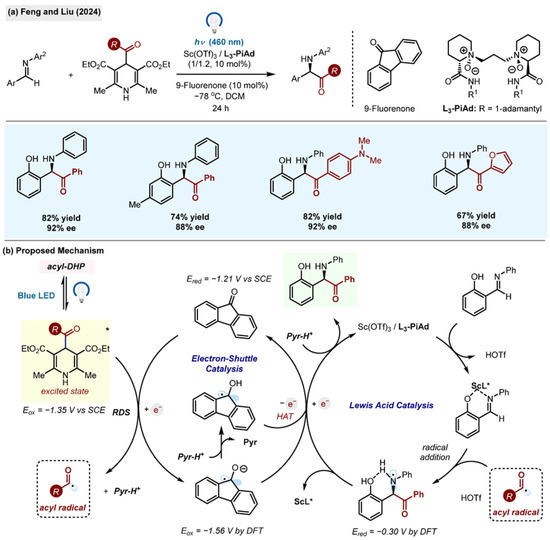 - Zhong, Z.; Wu, H.; Chen, X.; Luo, Y.; Yang, L.; Feng, X.; Liu, X. Visible-Light-Promoted Enantioselective Acylation and Alkylation of Aldimines Enabled by 9-Fluorenone Electron-Shuttle Catalysis. J. Am. Chem. Soc. 2024, 146, 20401–20413. [Google Scholar] [CrossRef]