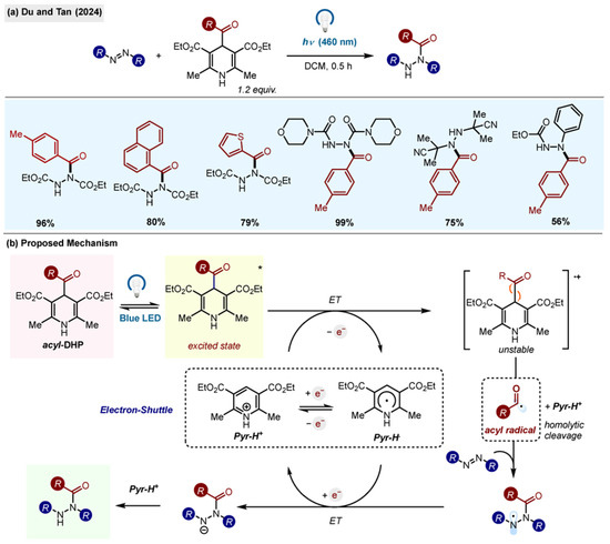 - Liu, L.; Wang, J.; Feng, X.; Xu, K.; Liu, W.; Peng, X.; Du, H.; Tan, J. Visible-Light-Mediated Photocatalyst-Free Hydroacylation of Azodicarboxylic Acid Derivatives with 4-Acyl-1,4-dihydropyridines. Chin. J. Chem. 2024, 42, 1230–1236. [Google Scholar] [CrossRef]