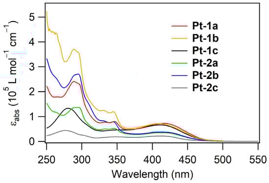 Figure 2 shows the UV-vis absorption spectra of Pt-1 and Pt-2 in de-aerated dichloromethane (10 μM) at rt, and the spectral data are summarized in Table 1. The assignment of transition bands was carried out basically according to the previous report for Pt-1c [40]. The absorption bands ranging in the near UV region at less than ca. 350 nm are ascribed to π–π* and weak charge transfer transition bands on the dppz and carbazole-appended phenylacetylide ligands. A broad absorption band with a molar absorption coefficient (εabs) of ca. 72,000 L mol−1 cm−1 was observed around 410 nm for each of Pt-1a and Pt-1b, which is assigned mainly to the intraligand charge transfer (ILCT) transition from the fluorenyl side-arms to the dppz core. For each of Pt-2a and Pt-2b, a similar absorption band with εabs of ca. 35,000–38,000 L mol−1 cm−1 was observed in the same region, assigned to the ILCT transition from the thienyl side-arms to the dppz core. Previously, we clarified that phosphorescence emission from Pt-1c is ascribed to the radiative process from the lowest triplet level (T1) to the ground-state singlet level (S0) consisting of metal-to-ligand charge-transfer (MLCT; dπ(Pt)-to-π*(dppz)) and ligand-to-ligand charge transfer (LLCT; π(phenylacetylide)-to-π*(dppz)) transitions [40]. Although the S0–T1 forbidden transition bands were not clearly observed, phosphorescent emission from the present platinum(II) complexes should be based on the MLCT and LLCT transitions. This assignment is supported by natural transition orbital (NTO) analyses based on time-dependent density-functional theory (TD-DFT) calculations for Pt-1a,c and Pt-2a,c (see Supplementary Materials).