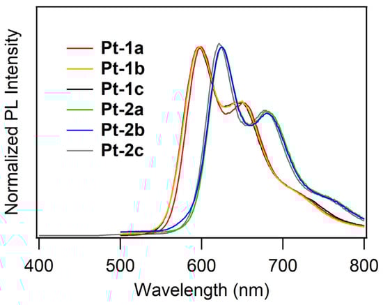 PL spectra of neat films of Pt-1 and Pt-2 at rt under nitrogen atmosphere. The spectrum for Pt-2c was not obtained because the low solubility in solvents prevented neat film formation.