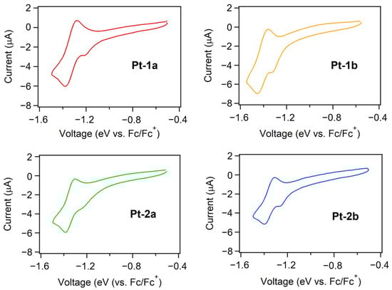 The energy levels of the highest occupied and lowest unoccupied molecular orbitals (HOMO and LUMO, respectively) of an emitting material are closely related to charge carrier injection into the emitting center in an OLED. To determine HOMO and LUMO energy levels (EHOMO and ELUMO, respectively) of Pt-1a,b and Pt-2a,b, their electrochemical properties were investigated. The obtained cyclic voltammograms are shown in Figure 5, and the data are summarized in Table 3. These complexes showed pseudo-reversible reduction cycles in which the half-wave reduction potentials vs. the ferrocene/ferrocenium (Fc/Fc+) redox couple, namely E1/2,red, were found at ca. −1.5 V, although an irreversible peak due to a small amount of residual oxygen was observed from −1.2 to −1.3 V. Thus, the ELUMOs were evaluated according to the Equation (1):