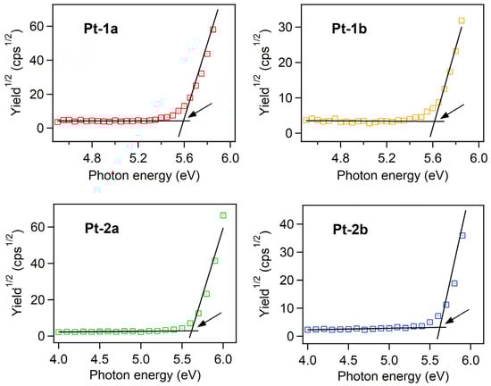 where E1/2,Fc is the redox potential for the Fc/Fc+ redox couple. As summarized in Table 3, the value of ELUMO ranged from −3.29 to −3.31 eV. Unfortunately, any reversible oxidation cycles were not observed for Pt-1a,b and Pt-2a,b, and thus, EHOMOs were not obtained from the electrochemical measurement. Instead, these values were determined by the ionization potential (IP) measurement using ultraviolet photoelectron spectroscopy under ambient conditions. The photoelectron yield spectra of neat thin films of Pt-1a,b and Pt-2a,b are shown in Figure 6. As summarized in Table 3, EHOMOs were determined as ca. −5.6 eV from the onset energies of the spectra [44,45,46]. As reported previously, the HOMO and the LUMO are localized at the phenylacetylides and the dppz moiety, respectively [40], independent of the side-arms. Additionally, the electronic properties of the phenylacetylide ligands should be determined by the 3,5-bis(3,6-di-tert-butyl-carbazol-9-yl)phenyl substructures. Thus, both EHOMO and ELUMO are almost the same among Pt-1a,b and Pt-2a,b.