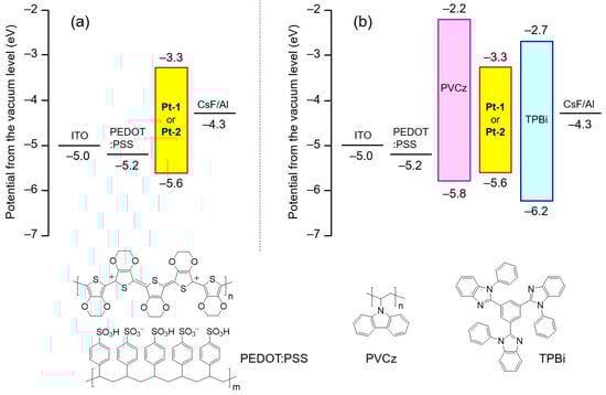 As shown in Figure 7b, the holes injected from the ITO anode (work function: −5.0 eV [28]) move to the EML of Pt-1 or Pt-2 (EHOMO: ca. −5.6 eV) through the PEDOT:PSS (EHOMO: −5.2 eV [28]) and PVCz (EHOMO: −5.8 eV [37]) layers, and then are blocked at the interface between the EML and the TPBi layer (EHOMO: −6.2 eV [28]) due to the relatively large EHOMO gap (0.6 eV) between the platinum(II) complexes and TPBi. The electrons injected from the cathode move to the EML (ELUMO: −3.3 eV), through the LUMO level of TPBi (ELUMO: −2.7 eV [28]), and are blocked at the interface between the EML and the PVCz layer because the ELUMO of PVCz (−2.2 eV [37]) is ca. 1.1 eV higher than that of Pt-1 (or Pt-2). Therefore, the injected holes and electrons should be encapsulated effectively in the EML, and therein efficient hole–electron charge recombination should occur to generate efficiently the excitons of the phosphorescent platinum(II) complexes.
