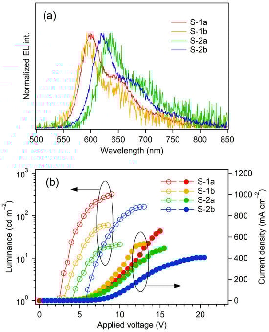 Among the fabricated devices, S-1a exhibited the highest Lmax of 324 cd m−2 and the largest maximum external quantum efficiency (ηext,max) of 0.37%. The maximum current efficiency (ηj max) and the maximum power efficiency (ηp max) were also quite modest: 0.59 cd A−1 and 0.46 lm W−1, respectively. In this term, the values of the carrier balance (γ) were calculated for all the devices according to Equation (2):