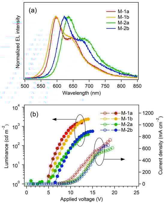 EL spectra at Lmax (a) and J–V–L curves (b) of devices M-1 and M-2.