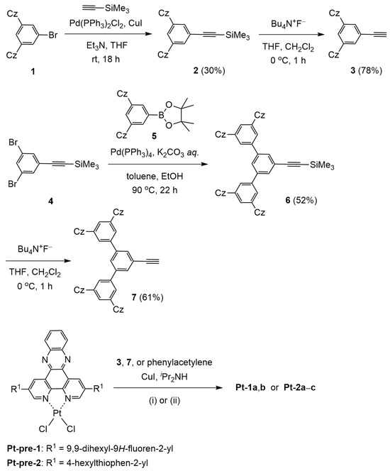 Syntheses of Pt-1a,b and Pt-2a–c. The substituent Cz represents the 3,6-di-tert-butyl-9H-carbazol-9-yl group. Conditions: (i) dichloromethane, rt (Pt-1a,b and Pt-2 a,b); (ii) toluene, 70 °C (Pt-2c).