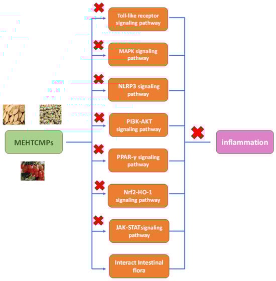 Since inflammatory responses are involved in many complex disease processes, the research and development of anti-inflammatory drugs is of particular importance. The intricate relationship between anti-inflammatory mechanisms and inflammatory diseases highlights the link between the two. Notably, the anti-inflammatory activity of MEHTCMPs has been proven by a large number of related studies; therefore, an in-depth study of the anti-inflammatory mechanism of MEHTCMPs has a very important role in the subsequent development of MEHTCMPs into novel anti-inflammatory drugs. As shown in Figure 1, MEHTCMPs exert anti-inflammatory effects via the Toll-like receptor signaling pathway, MAPK signaling pathway, NLRP3 signaling pathway, PI3K-AKT signaling pathway, PPAR-γ signaling pathway, Nrf2-HO-1 signaling pathway, and JAK-STAT signaling pathway and the regulation of intestinal flora.