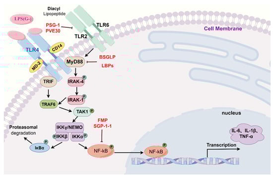 Toll-like receptors (TLRs) recognize different pathogen-associated molecular patterns and play integral roles in the innate immune response. They are the first line of defense against pathogen invasion and play key roles in inflammation, immune cell regulation, survival, and proliferation [27]. Different TLRs recognize different pathogenic microorganisms, and the study of TLR4 and its downstream signaling pathway has received extensive attention because of its important role in the immune response and inflammatory response [28,29,30,31,32,33,34,35]. Studies have shown that MEHTCMPs, such as Ganoderma lucidum polysaccharides, Lycium barbarum polysaccharides, Fructus mori polysaccharides, and Siraitia grosvenorii polysaccharides, exert their anti-inflammatory effects mainly by inhibiting the TLR-MyD88-NF-κB signaling pathway, as shown in Figure 2. Ganoderma lucidum polysaccharide and Lycium barbarum polysaccharide have therapeutic effects on hepatic inflammation. SANG T et al. reported that 300 mg/kg and 100 mg/kg Ganoderma lucidum polysaccharide (BSGLP) alleviated localized inflammation and fat accumulation in the livers of HFD-fed C57BL/6J mice. BSGLP significantly decreased the serum levels of the pro-inflammatory factors TNF-α, IL-1β, IL-6, and MCP-1 and reduced the Firmicutes/Bacteroidetes ratio in mice, while also significantly reducing Myd88 and TLR4 expression in mouse adipose tissue [36]. Aerobic training and treatment with Lycium barbaru polysaccharide (LBPs) at a dose of 50 mg/kg reduced IL-6, IL-1β, and TNF-α release from plasma and TLR4, MyD88, p38MAPK, and p-NF-κB p65 expression in the liver tissues of NAFLD rats; downregulated intestinal-derived lipopolysaccharide and hepatic lipopolysaccharide-binding protein expression; and increased ZO-1 and occludin expression, exerting hepatoprotective effects [23]. In addition, Fructus mori polysaccharide (FMP) and Siraitia grosvenorii polysaccharide (SGP-1-1) can treat inflammation caused by type 1/2 diabetes mellitus. Chen X et al. reported that 600 mg/mL FMP significantly inhibited the expression of TLR4, MyD88, p-IKKβ, and p-NF-κB p65 in the gut of T2DM mice and reduced the serum levels of TNF-α, IL-1β, and IL-6. The expression of claudin-1, occludin, and ZO-1 and the level of IL-10 increased to repair damage to the intestinal barrier and thus relieve intestinal inflammation and oxidative stress [37]. However, 50, 100, and 200 mg/kg SGP-1-1 can significantly inhibit the expression of TLR4 and NF-κB p65 mRNA in the kidneys of DN mice and stimulate the production of SOD, thus reducing the release of IL-6, TNF-α, and MDA and alleviating the damage caused by inflammation and oxidative stress in DN mice [38]. In addition, Ganoderma lucidum polysaccharide (PSG-1) and Codonopsis pilosula polysaccharide (CPP1-2-1) can alleviate inflammatory damage in mice with colitis. YING M et al. reported that 25, 50, and 100 mg/kg PSG-1 can effectively regulate the mRNA levels of TLR-2, TLR-4, and TLR-6 in Cy-induced colitis mice. Thus, the release of TNF-α, IL-1β, and IL-2 is reduced [39]. CPP1-2-1, on the other hand, reduces the expression of TLR4, NF-κB, TNF-α, and IL-6 in LPS-induced RAW264.7 cells in a dose-dependent manner and alleviates DSS-induced pathological injury in mice with colitis [40]. In addition, ZHAO Y et al. showed that a 600 mg/kg dose of Glycyrrhiza uralensis polysaccharide (GCP) significantly reduced the mRNA levels of IL-1β, IL-6, TNF-α, TLR-4, MyD88, and NF-κB; increased the serum levels of IL-4 and IL-10; and effectively alleviated hypothalamic inflammation in AA broilers [41]. LIU T et al. reported that 200 mg/kg Astragalus membranaceus polysaccharide (AP) inhibited CVB3-induced VM and that AP significantly reduced the expression of IL-1β, IL-6, TNF-α, INF-γ, MCP-1, TLR-4, and p-NF-κB p65 in CVB3-induced mouse hearts; moreover, the serum CK-MB, AST, LDH, LVEF, and LVFS levels were also significantly reduced after AP treatment [20]. PVE30, a polysaccharide isolated from Prunella vulgaris L., is a potential therapeutic drug against HSV. ZHONG X et al. reported that 5, 10, 20, and 40 μg/mL PVE30 significantly inhibited TLR2 expression in HeLa cells, which led to an inhibition of NF-κB activation and a reduction in IL-6 and TNF-α levels [42].