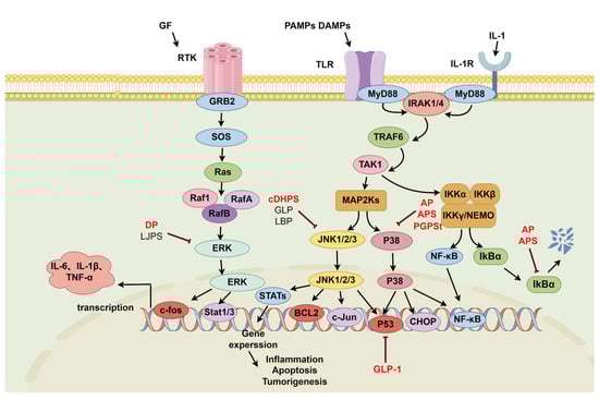 ERK is an important member of the MAPK family, and once ERK is activated and translocated into the nucleus, it activates transcription factors such as NF-κB and AP-1 [63]. Studies have shown that the abnormal activation of ERK is closely related to the pathological processes of many inflammatory diseases [64,65,66,67]. The polysaccharides of medicinal food and traditional Chinese medicine can prevent the abnormal activation of ERK and block the inflammatory process, as shown in Figure 3.