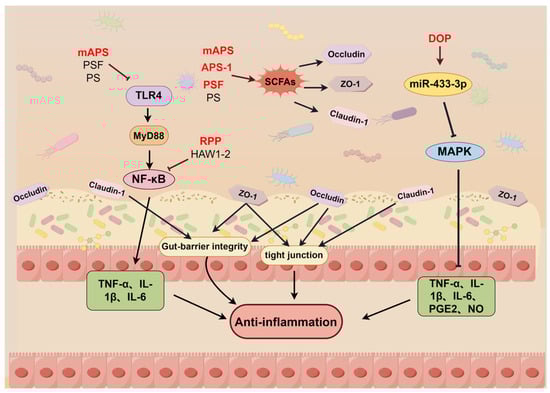 ZHONG M et al. reported that a 200 mg/kg dose of Astragalus membranaceus (mAPS) ameliorated hepatic inflammation and lipid accumulation, reduced HFD-induced body weight gain and elevated ALT and AST levels, decreased the expression of TLR4, NF-κB, and NLRP3, and decreased the Firmicutes/Bacteroidetes ratio in the colon and liver of rats, as well as GPR41 and GPR43 expression, while increasing the abundance of Proteobacteria and Epsilonbacteria and upregulating ZO-1 and OCLN expression to remodel gut microbes [121]. Pueraria montana var. thomsonii polysaccharide (RPP), with a molecular weight of 109 KDa, effectively alleviated alcohol- and HFD-induced hepatic injury and steatosis in mice at doses of 50 and 100 mg/kg, respectively, and the results showed that RPP downregulated the expression of TNF-α and inhibited the activation of the NF-κB signaling pathway but upregulated the expression of IL-10, which in turn improved the integrity of the intestinal barrier and regulated the intestinal microbiota composition [122]. In addition, Yang et al. found that continuous oral administration of 200 mg/kg Astragalus membranaceus polysaccharide (APS-1) for 8 weeks was an effective treatment for T1D, and the results showed that APS-1 significantly upregulated the expression of ZO-1, occludin, and claudin-1 to improve intestinal barrier function and increased the relative abundance of Muribaculum, Lactobacillus, and Faecalibaculum in the STZ-induced T1D to rebuild the intestinal microbiota, In addition, APS-1 significantly inhibited the expression of IL-6 and TNF-α and increased the release of IL-10 in pancreatic tissues of mice to decrease the level of inflammation, thereby alleviating T1D [123]. In addition, both Crataegus pinnatifida polysaccharide (HAW1-2) and Dendrobium officinale polysaccharide (DOP) were effective at alleviating intestinal inflammation in mice with DSS-induced colitis. GUO C et al. reported that a 30 mg/kg dose of HAW1-2 significantly inhibited the expression of the inflammatory factors IL-1β, IL-6, and TNF-α, as well as the phosphorylation of IKKα/β, IκBα, and NF-κB, in the colonic tissues of mice. In addition, Alistipes and Odoribacter were significantly enriched, and the production of SCFAs was significantly increased, suggesting that HAW1-2 alleviates intestinal inflammation by remodeling the composition of the intestinal microbiota [124]. Li H et al. reported that 0.5 mg/mL and 200 mg/kg DOP can interfere with the IEC secretion of small extracellular vesicles (DIEs) and regulate the load of miR-433-3p in intestinal sEVs via hnRNPA2B1. Increased expression of miR-433-3p in DIEs is thought to be an important protective factor against intestinal inflammation. DIEs deliver miR-433-3p to LPS-induced macrophages and inhibit the activation of the MAPK signaling pathway by targeting the MAPK8 gene. Thus, the levels of NO, TNF-α, IL-6, and PGE2 in the colon tissue of LPS-induced Caco-2/RAW264.7 cells and DSS-induced colitis mice were decreased [125]. In addition, GU W et al. reported that 120, 240, and 480 mg/kg of Polygonatum kingianum polysaccharide (PS) and a high-molecular-weight fraction (PSF) (>100 kDa) dose-dependently alleviated gastrointestinal inflammation and the dysregulation of glucose and lipid metabolism, increased the relative abundance and subsequent SCFA production of SCFA-producing bacteria, and significantly upregulated ZO-1 and occludin expression. In addition, it significantly inhibited TLR4 and IκB-α expression and TNF-α and IL-1β release in liver tissue [126].