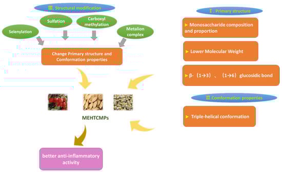 At present, most studies on the relationship between the polysaccharide structure and efficacy have focused on the primary polysaccharide structure. The primary structures of polysaccharides are closely related to their biological activities [155,156]. Therefore, current research on the relationship between the activity and structure of MEHTCMPs is mainly based on their primary structures. At the same time, a number of studies have shown that a lower molecular weight, different compositions and proportions of monosaccharides, and β-(1→3), (1→6) glucoside linkages are the main factors affecting the anti-inflammatory activity of METCMPs.