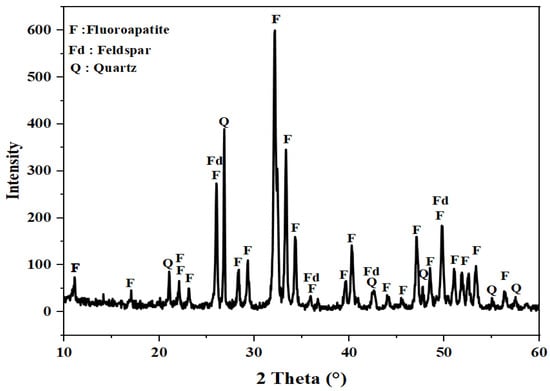 The XRD pattern of the calcined natural phosphate (Figure 1) revealed that the dominant minerals are fluorapatite, quartz, and feldspar [33].