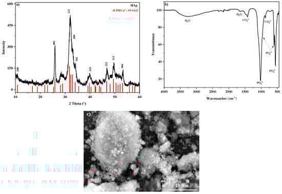 (a) XRD pattern; (b) ATR−FTIR spectra; and (c) SEM image of the prepared HAp.